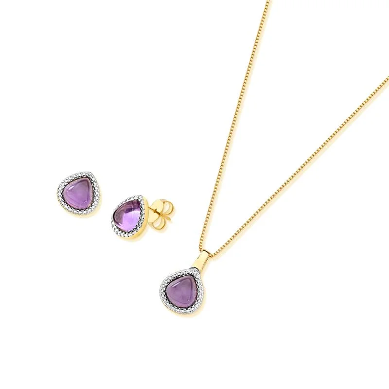 O Conjunto Ametista une sofisticação e simbolismo em joias delicadas e marcantes. O brinco de 1,3 cm e o pingente de 1,9 cm apresentam pedras ametistas em lapidação cabochão no formato de gota, revelando um brilho sutil semelhante ao da zircônia, realçado pelo acabamento em ródio branco.