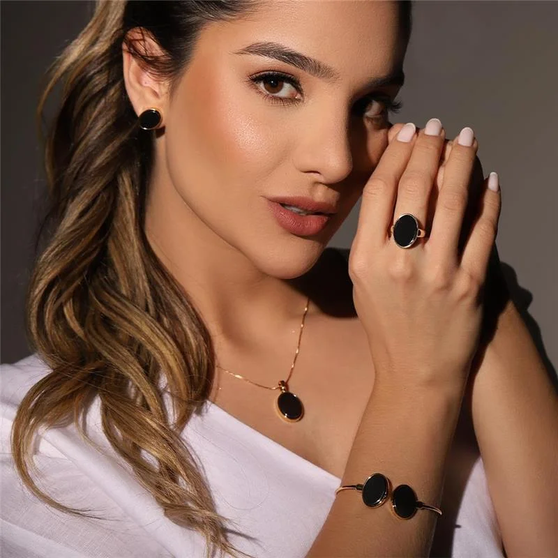 Conhecida por transmitir equilíbrio e poder, a hematita traz presença marcante e refinamento a cada detalhe. Um conjunto versátil e exclusivo, perfeito para compor produções que unem modernidade e elegância em qualquer ocasião.